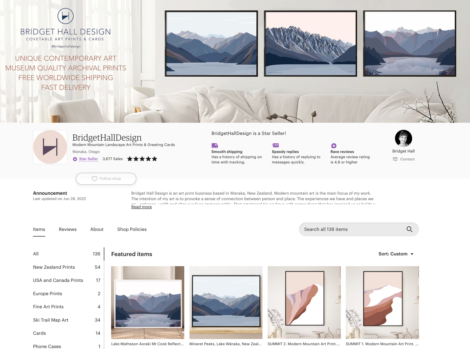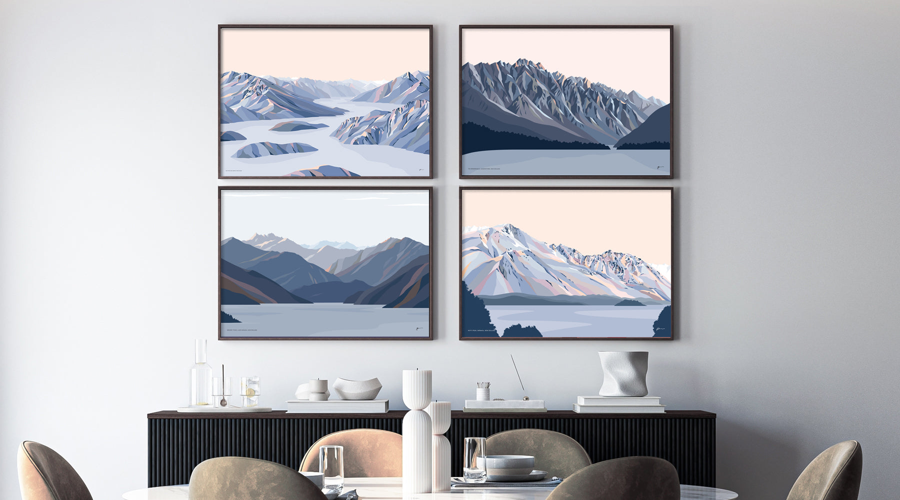 Welcome to Bridget Hall Design home to my collection of modern landscape art prints. Inspired by travel and beautiful places, most of my work is focused on contemporary mountain wall art of memorable places in New Zealand, USA and Europe.