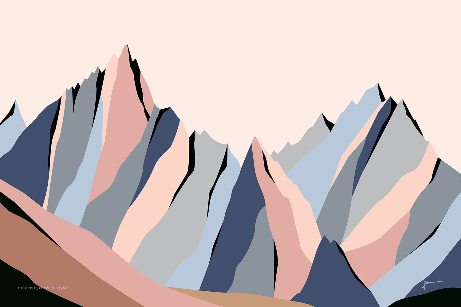 The vast mountain peaks and glaciers including Mont Blanc straddle the border between France, Switzerland and Italy. In this print I wanted to capture the sharp, jagged terrain of the Needles in a modern style that would look amazing on your wall.