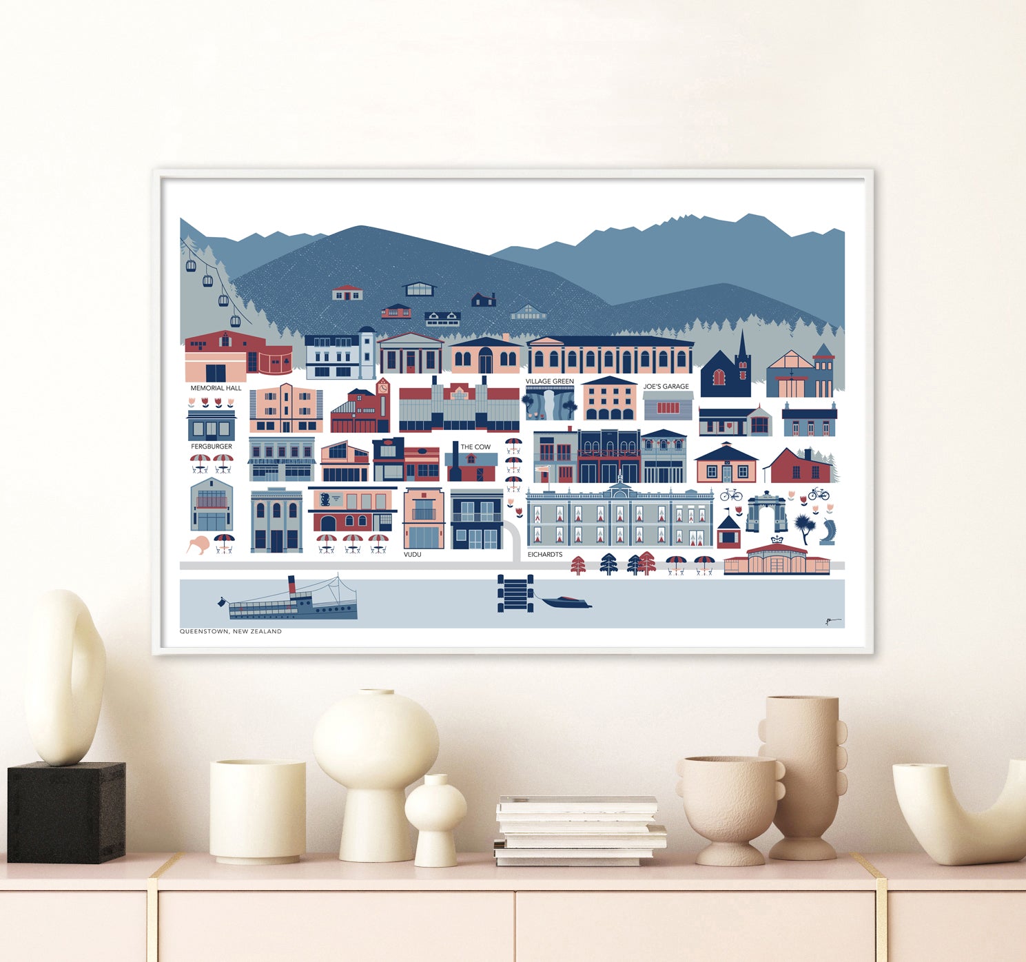 Queenstown is a favourite spot for travellers who are attracted to the incredible scenery and the fun vibe of this bustling little town. This art print shows many of Queenstown's iconic buildings from historic gold miners cottages to modern architecture. This beautiful wall art print also includes Ferg Burger, Vudu Cafe, Joe's Garage, Eichardts Hotel, the Queenstown Gondola and the Earnslaw Steam Ship on Lake Wakatipu. Every detail has been painstakingly created to accurately depict the real buildings and places that make Queenstown an unforgettable and special part of the world.
