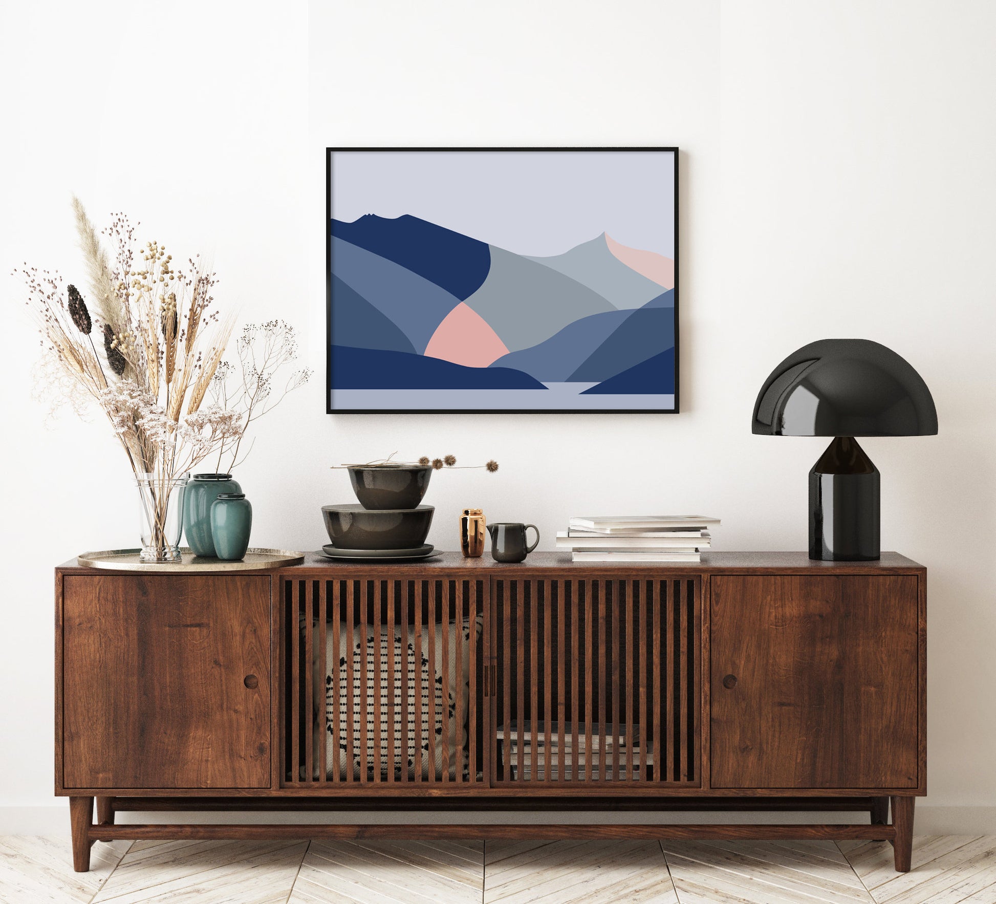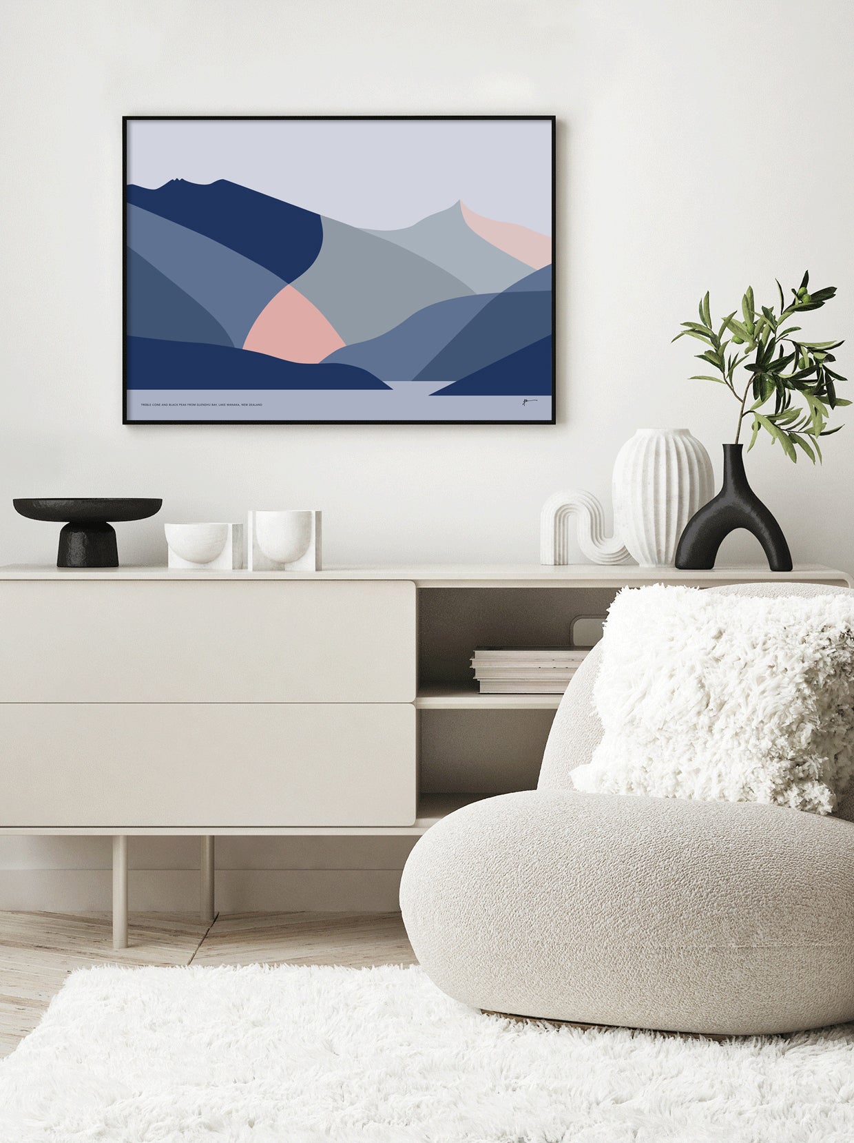 My unique abstract landscape mountain art print of my local mountains. I know I'm home when I'm driving towards Wanaka and see Black Peak and Treble Cone pointing skyward on the horizon! This modern landscape print is the stunning view from Glendhu Bay on the shores of Lake Wanaka. This modern, abstract mountain art print is unique and contemporary. I have used a palette of soft pinks, blues and greys that to make the layers of mountains seem transparent. I hope you love it!