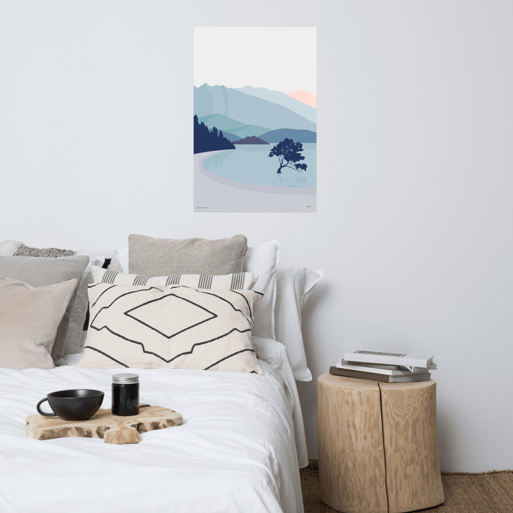 A beautiful Lake Wanaka tree and mountain landscape art print. Wanaka is one of the best places to visit in New Zealand and the lone tree that has grown in the lake is probably New Zealand's most famous tree #thatwanakatree (along with Tane Mahuta)!