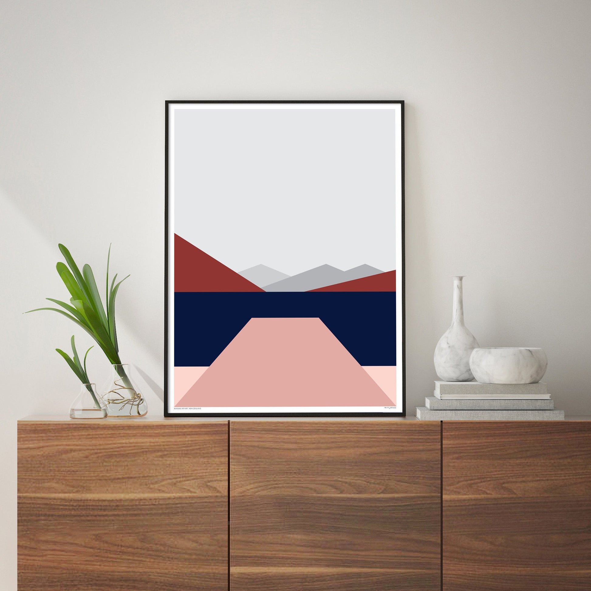 For this abstract landscape art print I've stripped the shapes back to their essence. This print is the view of Lake Wanaka and the mountains beyond from the Wanaka Wharf. This pared back modern scandi style art print uses a subtle palette of earthy tones to give a room a warm rustic but contemporary atmosphere.